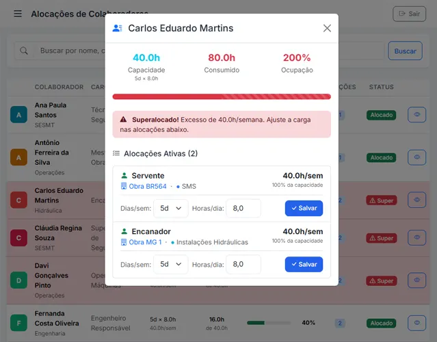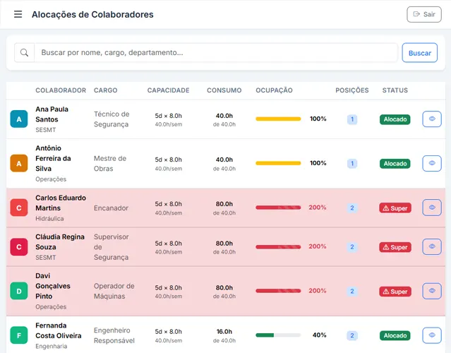 Reduza superalocação e sobrecarga invisível antes que elas impactem produtividade, segurança e qualidade. Transforme capacidade em variável controlada, não em suposição operacional.
