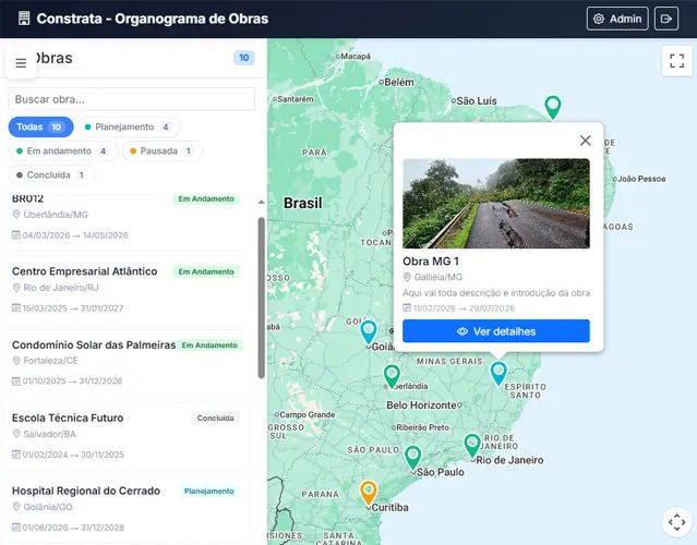 Você enxerga, em segundos, onde estão suas obras, quem está em cada projeto e como a estrutura está distribuída por região e função. A visibilidade deixa de ser fragmentada e vira um mapa consolidado do headcount.